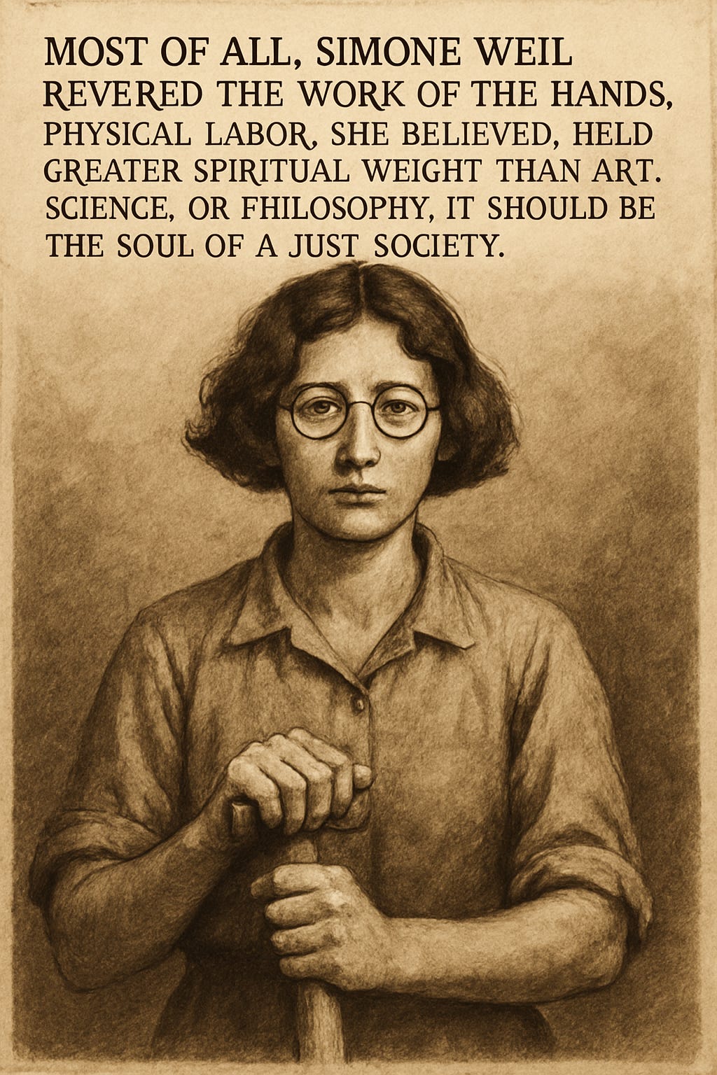 Instead, she revered the work of the hands. Physical labor, she believed, held greater spiritual weight than art, science, or philosophy; that it should be the soul of a just society.